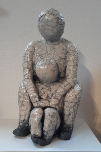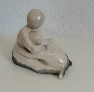 2011Beeld van grove klei, raku gestookt. Het beschermde kind bewerkt met koperoxyde.